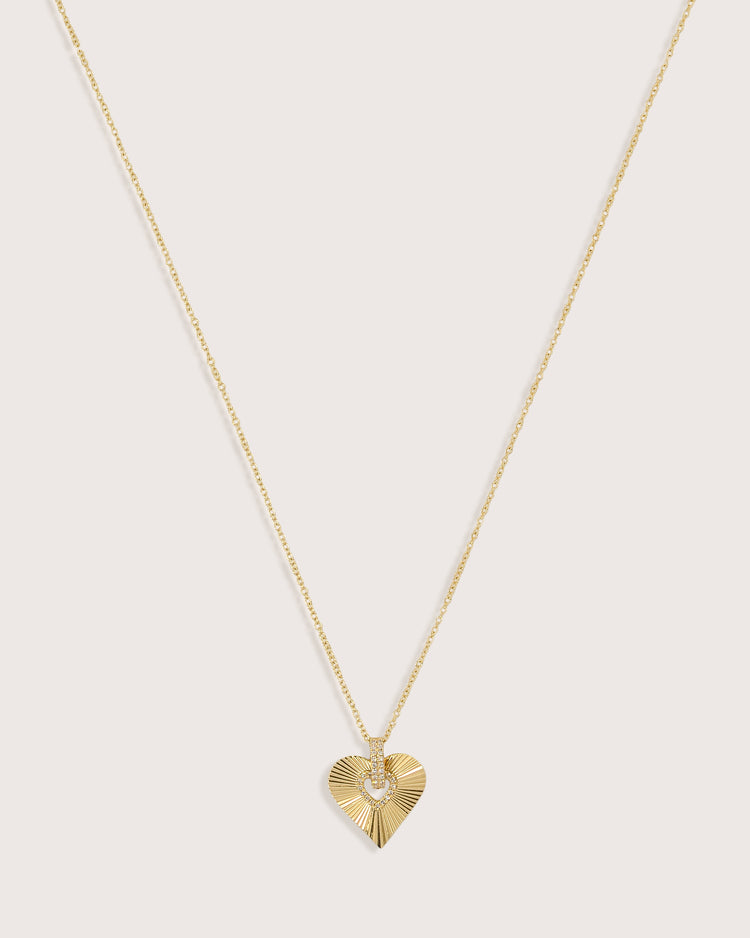 Radiating lines meet a classic heart silhouette—this pendant catches the light beautifully, with a single diamond at the center for just a hint of shine. A timeless piece with a little extra warmth.